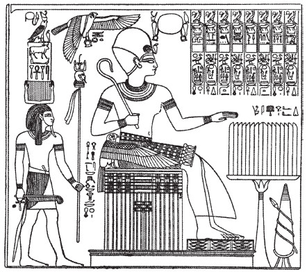 Рис. 47. Сети I перед жертвенником. За царем – его Ка, он защищает царя и несет его имя Гора-Ра. Абидос