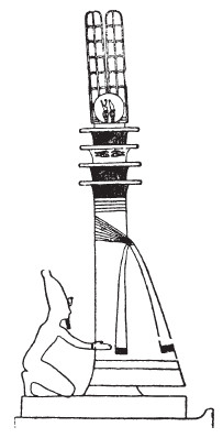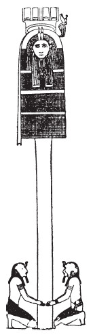 Эта ассимиляция с Хент-Аменти была сравнительно поздней, она вступила в силу лишь после 2000 года до н. э., но Осирис уже давно завоевал некрополи нома и гробницы тинитских царей. Как гласит наша таблица номов, древним названием нома Абидоса было Та-Ур – «Великая Земля», он был связан с Осирисом, носившим характерные перья, взятые им у Анцти из Бусириса. Символом нома уже был сосуд, увенчанный перьями, в котором хранилась глубоко почитаемая голова бога (рис. 58). Впоследствии одна из тинитских гробниц, а именно усыпальница царя Хента, превратилась в кенотаф Осириса, возможно, по причине сходства имен Хент и Хент-Аменти, причем последнее уже стало вторым именем Осириса. Пе реселенный в Абидос, бог Бусириса стал там великим богом мертвых, что выражалось в произнесении его имени во множественном числе. Хент-Аменти часто превращался в ХентАментиу, «Владыку жителей Запада», то есть умерших, погребенных на Западе. В гробнице царя Хента Амелино обнаружил погребальное ложе из песчаника, украшенное львиными головами и лапами. На ложе покоилась мумия Осириса в Белой Короне Юга. В четырех углах ложа несли стражу четыре сокола – четверо сыновей Гора. Но на мумии, на ее эрегированном фаллосе восседает птица (zert) – богиня Исида в момент, когда она зачала от воскресшего бога. Этот памятник датируется Новым царством, но является, по всей видимости, точной копией более древнего кенотафа, существовавшего в эпоху Древнего царства, в Тинитский период и уж определенно при XII династии. На надгробных плитах в некрополе Абидоса часто можно увидеть пожелание покоиться рядом с «лестницей Великого Бога, в Абидосе, на внушающем трепет кургане (uart), к которому придут и живые и мертвые и на котором покоится Великий Бог». Некрополь называли Пекер или Ра-Пекер, он часто становился сценой совершения ритуалов.