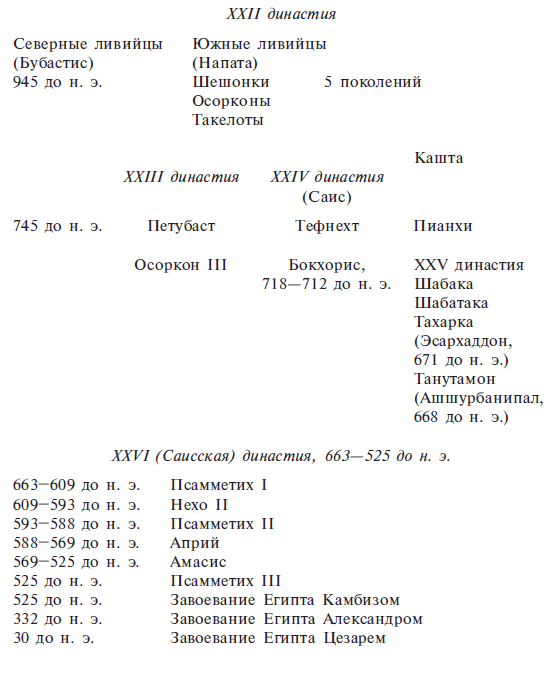 В промежутке между двумя царствованиями Фив и Таниса, а также в правление каждого из них независимости удалось добиться и другим княжеским домам. Дни феодализма вернулись, однако цари XXI и XXII династий вряд ли даровали вольности. Вожди наемников брали их либо силой, либо пользуясь своим авторитетом. Приведу хорошо известный пример. В Гераклеополе, в Центральном Египте, Буювава, вождь ливийских наемников, захватил власть примерно в то время, когда царем был Панеджем I. Шестеро из его потомков поочередно носили титулы «Божественный отец Херишефа» (местный бог) и «Великий начальник машауаша» (название ливийского племени, поставлявшего наемников, – Mashau, Meshau). Седьмой, Шешонк I, завоевал Дельту и основал в Бубастисе XXII династию. Восьмым, девятым и десятым потомками Буювавы были цари Осоркон I, Такелот I и Осоркон II. Но Гераклеополь вновь стал независимым уделом, апанажем, управляемым царскими сыновьями, потомками Осоркона II, носившими титул «Наместник Юга,