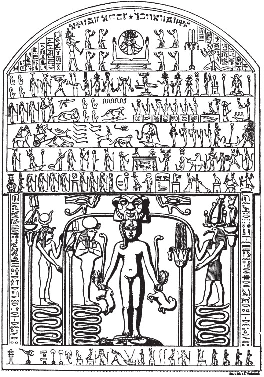 Рис. 71. Гор Спаситель побеждает тифонийских зверей. Так называемая Стела Меттерниха. Бога-ребенка окружают Ра, Исида и Тот. Над его головой – маска Беса, которую Гор надевает, чтобы устрашить врагов. В верхней части рисунка – сцены поклонения Ра и изображения богов, сражающихся против магов