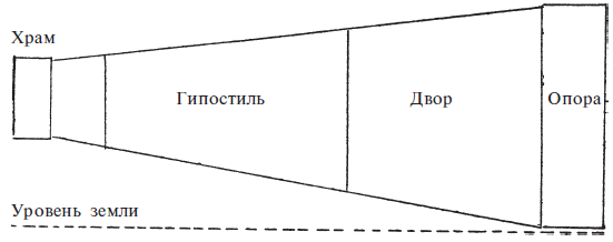 Солярный принцип проявляется и в другой характерной черте, общей для всех храмов. От пилона к гипостилю и святилищу уровень пола постепенно повышается, в то время как крыша становится ниже. Пилон – это высшая точка храма, гипостиль ниже пилона, а самой невысокой частью храма является святилище. Постепенный подъем можно сравнить с эффектом музыкального крещендо. Линиями крыши и пола, сходящимися к святилищу, зодчий словно хотел показать каждодневный восход солнца над восточным горизонтом и его возвращение к горе Запада, вечернему горизонту (илл. 42, 43).