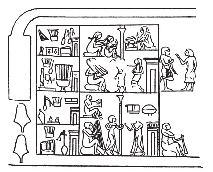 Кресло рисуется в профиль, а сиденье его анфас. Изображая храм или дворец, египетский художник помещает дверь, двор, гипостиль и внутренние помещения друг над другом, чтобы они четко просматривались. Если художник должен нарисовать сцену с множеством фигур, находящихся на одном уровне, он изобразит фигуры одного размера, одну над другой. Занятый исключительно передачей размеров, художник не видит перспективы, ракурса. Таким образом, изображение каждой фигуры или предмета самостоятельно и не зависит от его окружения. В общей структуре рисунка изображение сохраняет свое значение (рис. 76).