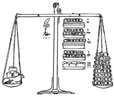 Рис. 82. Золотые цепи, взвешиваемые на весах. Грузы и слитки выполнены в виде животных. (Храм в Дейр-эль-Бахри)