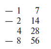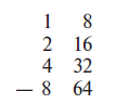 Чтобы найти результат умножения 8 Ч 8, писец записывает колонку цифр, начинающихся с 1, и умножает на 2, пока не дойдет до цифры 8, отметив ее чертой. Затем он записывает вторую колонку, начинающуюся с 8, и умножает на 2 до тех пор, пока не получит результат: