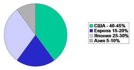 Мощной биотехнологической промышленности, работавшей в СССР, больше нет. У нас уничтожено производство систем накопления информации и полупроводников, не делаются новые материалы. Производство полимеров еле теплится. Ну и где мы будем использовать технологии, что собирается создавать "Роснанотех"? За рубеж с ними идти? Но там уже места под солнцем поделены, русских никто не ждёт. Взглянем на диаграмму глобального раздела рынка нанотехнологий.