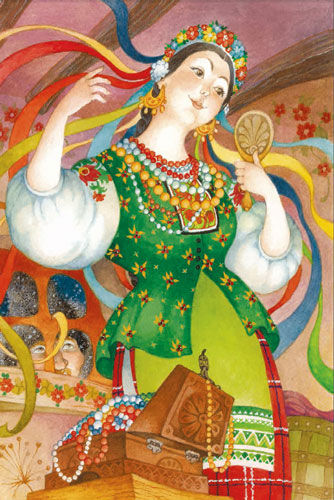Тут села она на лавку и снова взглянула в зеркало и стала поправлять на голове свои косы. Взглянула на шею, на новую сорочку, вышитую шёлком, и тонкое чувство самодовольствия выразилось на устах, на свежих ланитах [24] и отсветилось в очах.