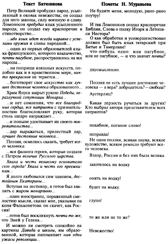 Текст Батюшкова Пометы Н. Муравьева Петр Великий пробудил народ, усып- Не будите меня, молодую, рано-рано ленный в оковах невежества; он создал поутру! для него законы, силу военную и славу. Ломоносов пробудил язык усыпленного И так Ломоносов создал красноречие народа; он создал ему красноречие и Библии, Слова о полку Игоря и Летопи — стихотворство… си Нестора? …ибо язык идет всегда наравне с успе- О как обработан и усовершенствован хами оружия и славы народной… должен был быть язык татарский при …один из первых образователей язы- Батые и Тамерлане! ка французского, которого владычество, что-нибудь одно, или пагубное, почти пагубное, распространилось на все или не пагубное, — и что значит почти. народы… …на поприще изящных искусств, по- двусмысленно добно как и в нравственном мире, нич — то прекрасное не теряется… …боготворят свое искусство как луч– Поэзия не есть лучшее достояние че — шее достояние человека образованного… ловека — а вера? добродетель? — свобода? Храм Януса закрыт рукою Победы, не- Аустерлиц? разлучной сопутницы Монарха… …и нет сомнения, что все благород- Какая дерзость ручаться за других! ные сердца, все патриотыс признатель- Кто выбрал автора представителем всех ностию благословляют руку, которая патриотов? столь щедро награждает… …и поныне удостаивает их своего пок — ровительства… похабное, поганое слово! …дар выражаться, прелестный дар, лучшее достояние человека… неправда. Поэзия, осмелюсь сказать, требует все- Не одна поэзия, всякая наука, всякое го человека. художество, всякое ремесло требуют все — го человека. …вся фаланга героев, которые создали с Петром величие Русского царства. Вздор, Россия и без них была велика. Хвала и честь великому основателю сего города! Хвала и честь его преемни- захотелось на водку кам… Я долго любовался сим зданием, дос- опять на водку тойным Екатерины… Вступая на лестницу, я готов был хва- будет на водку. лить с жаром монархиню… …один иностранец, пораженный сме — лостию мысли, сказал мне, указывая на глупо! коня Фальконетова: он скачет, как Рос — сия! …готов был воскликнуть почти то же, то же или не то же? что Эней у Гелена… И можно ли смотреть спокойно на картины Давида и школы, им образо- Невежество! ванной, которая напоминает нам одни ужасы революции…Даже эта подборка «избранных помет» Муравьева демонстрирует, что в основе негативного отношения декабриста к прозе Батюшкова лежали не политические пристрастия. Среди таковых можно указать на отрицание Муравьевым «покровительства» и «меценатства» (благодетельное воздействие которых Батюшков много испытал на себе), иронические отзывы о российских монархах или почитание картин Ж. Л. Давида. Но не они определяют его отрицательное отношение к морализаторским опытам поэта. Более всего Муравьева не удовлетворяет, во-первых, постоянно упование Батюшкова на «язык», «поэзию», «искусство» как высшие сферы человеческой деятельности (именно к ним Батюшков пытался «приохотить» своего воспитанника). Во-вторых, и главное: Муравьев никак не может понять и принять батюшковской «многосмысленности». Что значат выражения «почти пагубная», «почти то же» — «что значит почти?», «то же или не то же»?