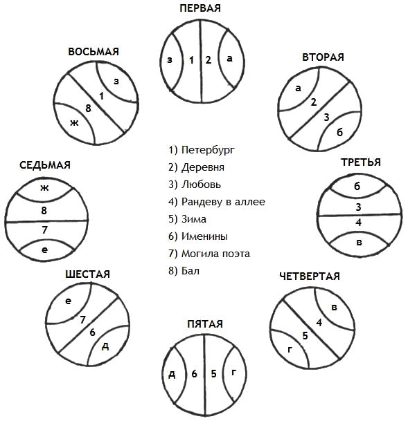 каждой главы продолжается в первой половине следующей: 1. «Петербург» в первой половине первой главы; 2. «Деревня» во второй половине первой и первой половине второй главы (I > II); 3. «Романс» во второй половине второй и первой половине третьей главы (II > III); 4. «Встреча в аллее» во второй половине третьей и первой половине четвертой главы (III > IV); 5. «Зима» во второй половине четвертой и первой половине пятой главы (IV > V); 6. «Именины» во второй половине пятой и первой половине шестой главы (V > VI); 7. «Могила поэта» во второй половине шестой и первой половине седьмой главы (VI > VII); 8. «Кружение светских развлечений» во второй половине седьмой и первой половине восьмой главы (VII > VIII); и, наконец, опять (и обратно) 1. «Петербург» во второй половине восьмой и первой половине первой главы (VIII > I). В свою очередь связный ход развития этих тем образовывает круговой роман в целом. Каждая глава является кругом; все главы вместе оказываются кругом — романом в круговой форме.Так, первая глава начинается представлением Онегина на пути в деревню к дяде с надеждой на наследство. «Стилизованный Пушкин» тотчас же обращается к читателю, спешит представить своего друга Онегина:
