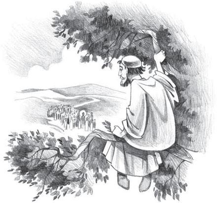 пальцами и смеялись: вот, мол, богатый и важный человек, а как простой мальчишка взбирается на дерево. Но ему было не до того. Он сидел на дереве и ждал. Может быть, надеялся остаться незамеченным среди ветвей и листьев смоковницы. Однако Христос, проходя мимо, увидел его и сказал: «Закхей! сойди скорее, ибо сегодня надобно Мне быть у тебя в доме» (Лк. 19, 5).И Закхей поспешно сошел и оказался пред лицом Самого Господа, увидел Его вблизи. Он был смущен и несказанно обрадован, но надо было торопиться домой, чтобы принять у себя дорогого Гостя. И принял он Его с радостью.