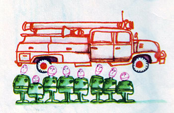 В одном из районов города, где движение было особенно оживленным, между двумя широкими улицами находилось пожарное депо. На втором и третьем этажах этого дома были помещения для пожарников, а на нижнем этаже, за дверьми, похожими на высокие ворота, стояли ярко-красные автомобили, готовые в любую минуту сорваться с места под рев сирен.