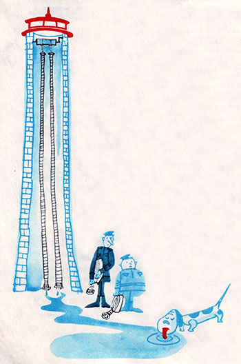 Пожарники Белоземкин и Черноголовкин только что развесили целую охапку шлангов и собирались сделать то же самое с остальными, как вдруг заметили небольшую собачку, которая лакала воду, набежавшую на цементный пол.