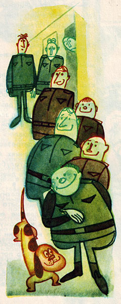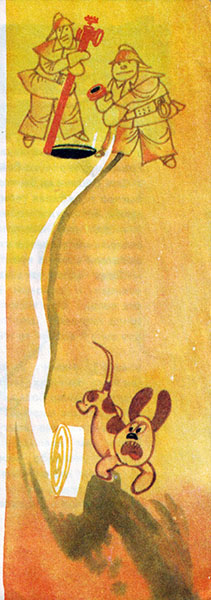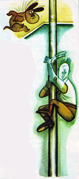 Когда пожарник Белоземкин кончил чистить картошку и решил пойти в комнату отдыха почитать свежие газеты, он, к своему великому удивлению, столкнулся на втором этаже со странной процессией. Впереди выступала пятнистая собачка с мордой гончей. Рядом,