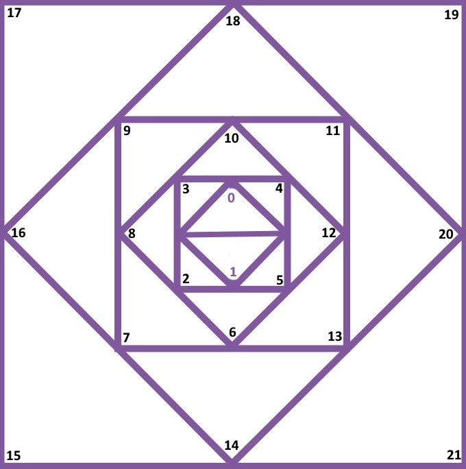Схематично Кармическая Карта представляет собой шесть квадратов, вписанных друг в друга. Они поделены на треугольные сегменты, для удобства назовем их Домами, это понятие взято из астрологии.