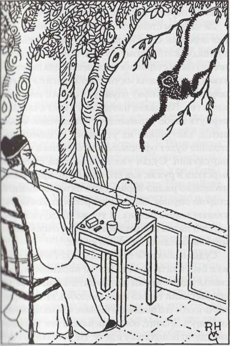 Вдруг птицы смолкли. Среди качающихся ветвей показались два черных гиббона. При помощи длинных, тонких рук они с необычайной легкостью скользили с ветки на ветку, и дождь осыпающихся листьев отмечал путь их передвижений. С улыбкой судья наблюдал за ними. Его всегда очаровывала изящность движений, с которыми гиббоны могли двигаться по деревьям. И эти пугливые животные уже настолько привыкли к неподвижной фигуре, которую каждое утро видели на галерее, что иногда кто-нибудь из них даже свешивался с ветки, чтобы ловко схватить пирожок или кусочек сахару, брошенный им судьей. В листве снова зашелестело, и появился третий гиббон. Он двигался медленнее других, потому что, помимо ног, цеплялся за ветки только одной рукой; правая же у него была прижата к груди. Он присел на ветку прямо над головой судьи Ди и, помахивая свободной левой рукой, чтобы сохранять равновесие, с любопытством посматривал на него. И тут судья увидел, что он что-то сжимает в руке. Это был золотой перстень с большим зеленым камнем, который поблескивал в лучах солнца. Конечно же, обезьяна его где-то похитила. Нужно было как можно скорее отобрать его, потому что гиббоны очень быстро утрачивают интерес к добытым ими предметам, особенно когда обнаруживают, что добыча несъедобна. Если сейчас позволить гиббону исчезнуть, то этот перстень будет выброшен где-нибудь в лесу, и он уже никогда не вернется к хозяину.