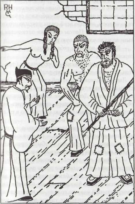 Сэн Цю взял в углу бамбуковую палку и замахнулся, словно бы намереваясь нанести Дао Ганю сильный удар по голове, но неожиданно изменил ее направление таким образом, что другой конец палки ударил сестру по мягкому месту. Девушка взвилась, вскричав от боли.