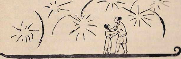 Мальчишки и взрослые пускали шутихи — кусочки бамбука, начиненные порохом, которые взрывались с громоподобным ударом, вскидывая вверх фонтаны искр, и ракеты «двойное эхо», которые взносились ввысь и там разлетались на тысячи кусков. Перед дверями магазинов стояли на помостах огромные огненные корзины. Из них вылетали пламя, искры и пурпурные шары, похожие на раскаленные виноградины. Стремительно кружились длинные нити золотых капель, взлетали в небо чудовищные огненные деревья с ослепительными серебряными листьями и цветами. Всюду зажглись красные фонари с светящимися пожеланиями счастья.