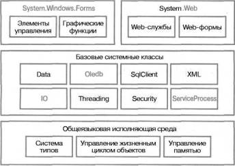На следующем логическом уровне над средой CLR располагаются базовые системные классы. Именно эти классы отвечают за выполнение базовых функций, которые могут использоваться в .NET-приложениях. На рис. 4.1 показаны только некоторые классы библиотеки классов .NET Framework, которая, по сути, является новым набором API-интерфейсов Windows. В прошлом доступ к функциям операционной системы Windows осуществлялся только через API-интерфейсы, которые состояли из большого набора разрозненных и плохо продуманных функций. На платформе.NET Framework такой доступ организован на основе свойств и методов, которые предлагаются базовыми системными классами. Это объектно-ориентированный, последовательный и комфортабельный способ создания приложений Windows, независимо от типа клиентского приложения: традиционного настольного приложения, броузера или Web-службы.