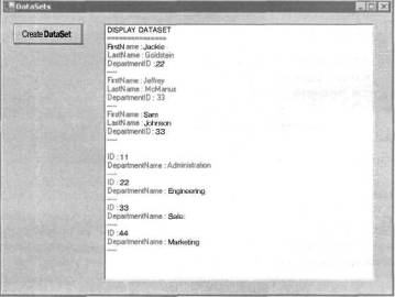 В листинге 5.4 показан код подпрограммы DisplayDataSet, которая отображает содержимое ранее созданных таблиц с загруженными в них данными. В ней применяется циклический обход всех элементов коллекции, т.е. коллекций Rows и Columns, для отображения содержимого таблицы Employees. Далее используется альтернативный метод доступа к записям и полям с помощью числового индекса для отображения содержимого таблицы Departments.