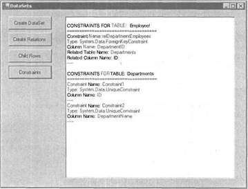 После компоновки проекта DataSetCode и запуска полученного приложения щелкните на кнопке Constraints, и в текстовом поле будет выведена информация о созданных ограничениях (рис. 5.4). Учтите, что все три показанных ограничения (одно для таблицы Employees и два для таблицы Departments) созданы автоматически, так как во время создания отношения между таблицами для свойства Unique объекта DataColumn задано значение True.