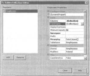 19. Щелкните на кнопке Close в диалоговом окне Columns Collection Editor, чтобы вернуться в диалоговое окно Tables Collection Editor для включения в набор данных dsEmployeeInfо еще одной таблицы Departments.