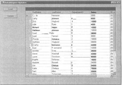 Скомпонуйте проект DataSetCode и щелкните на кнопке DataAdapter Updates в форме frmDataSets. После отображения на экране формы frmUpdates щелкните на кнопке Load. Это приведет к считыванию данных из таблицы Employees, загрузке данных в объект tblEmployees объекта dsEmployeeInfo и отображению их в сетке, как показано на рис. 6.2.