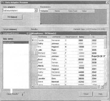 РИС. 6.З. Данные, вставленные в набор данных из таблицы tblEmployee с помощью диалогового окна предварительного просмотра данных Data Adapter Preview