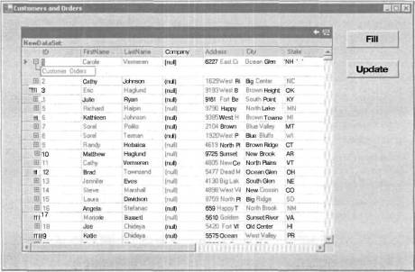 6. Чтобы проверить корректность внесенных изменений, щелкните на кнопке Fill для повторной загрузки информации из базы данных в объект DataSet и сетку. Откройте первую запись таблицы Customers и найдите ее дочерние записи. Убедитесь в том, что среди них находится введенная вами дочерняя запись.