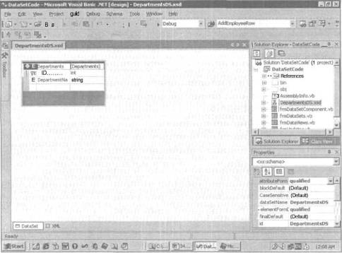 4. Щелкните дважды на файле DepartmentDS.xsd в окне Solution Explorer для отображения диалогового окна редактирования схемы XML.