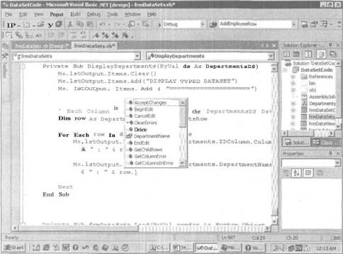 РИС. 7.8. Контекстное меню средства IntelliSense со свойствами типизированного объекта DataSet