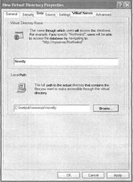 После выбора виртуального каталога на экране появится новое диалоговое окно New Virtual Directory Properties (Свойства нового виртуального каталога) с шестью вкладками. В первой вкладке, General, предлагается ввести имя виртуального каталога, а также путь к локальному каталогу, где располагаются файлы. Введите в текстовом поле Virtual Directory Name (Имя виртуального каталога) имя Novelty, а в текстовом поле Local Path (Локальный путь) укажите путь к локальному каталогу с:\inetpub\wwwroot\novelty, как показано на рис. 9.7.