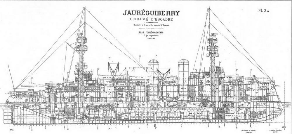 Публикуемые чертежи, хранящиеся ныне в архиве Главного Представительства по вооружению в Шатёльро, дают полное представление о конструкции броненосца и его внутреннем расположении. Поэтому при его описании мы обратим внимание лишь на некоторые моменты.