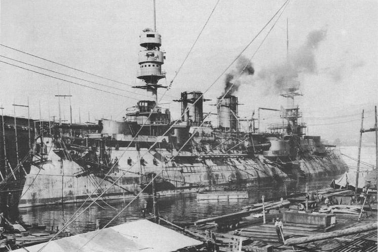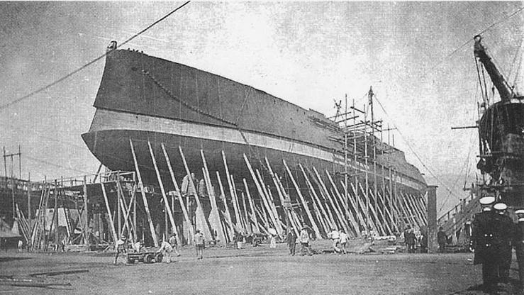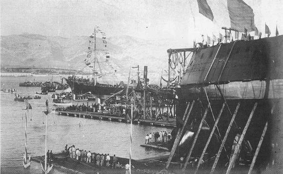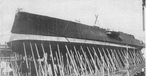 27 октября 1893 г. Корпус броненосца Жорегибери" перед спуском на воду. На фото вверху в правом углу видны русские офицеры посетившие верфь перед спуском корабля.