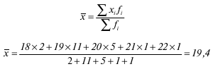 Наряду с простой средней арифметической изучают среднюю арифметическую взвешенную. Например, рассчитаем средний возраст студентов в группе из 20 человек, возраст которых варьируется от 18 до 22 лет, где xi – варианты осредняемого признака, f – частота, которая показывает, сколько раз встречается i-е значение в совокупности.