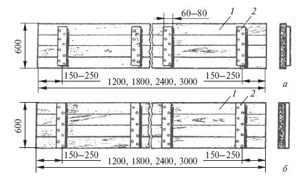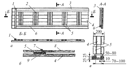 Рис. 64. Унифицированные щиты деревянной разборно-переставной опалубки: а – для фундаментов, стен, колонн, плит, перекрытий; б – для ленточных фундаментов, балок, прогонов и ригелей рам; 1 – палуба; 2 – сшивная планка