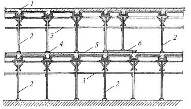 Рис. 67. Поэтажные леса для поддержания опалубки: 1 – бетонируемое перекрытие; 2 – стойки; 3 – раскосы (расшивины); 4 – лаги под стойки; 5 – забетонированное перекрытие; 6 – подкладка для передачи нагрузки на стойки нижерасположенного этажа