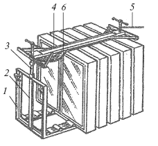 Рис. 111. Контейнер для перевозки оконных и дверных блоков: 1 – рама; 2 – стойка; 3 – выдвижная штанга; 4 – прижимная балка; 5 – зажимный винт; 6 – прорезиненная лента