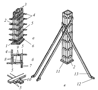 Рис. 159. Опалубка стен: а – доска направляющая, установленная на грунт; б – доска направляющая, установленная на бетонную подготовку; в – общий вид опалубки стены; г – ребро, собранное из двух досок; 1 – направляющая доска; 2 – колышек; 3 – пробка; 4 – щит стены; 5 – ребро; 6 – временная распорка; 7 – проволочная скрутка; 8 – схватка; 9 – брусок бетонный полый