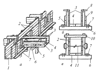 Рис. 158. Установка опалубки балок и прогонов: а – общий вид установки; б – поперечное сечение короба при наличии плиты; в – поперечное сечение короба при отсутствии плиты; 1 – днище короба прогона; 2 – боковые щиты короба прогона; 3 – боковые щиты короба балки; 4 – днище короба балки; 5 – подставка; 6 – оголовник стойки; 7 – прижимные доски; 8 – доска опалубки плиты; 9 – доска подкружальная; 10 – схватки; 11 – стяжки