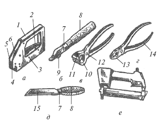 Рис. 171. Инструменты и приспособления для остекления: а – пистолет для забивки шпилек; б – запасовщик ручной; в – кусачки; г – плоскогубцы; д – нож для отделочных работ; е – пистолет ИП-4401; 1 – корпус; 2 – спусковой рычаг; 3 – ударный механизм; 4 – пуансон; 5 – матрица; 6 – возвратная пружина; 7 – колпачок; 8 – ручка; 9 – направляющий ролик; 10 – нижний рычаг; 11 – верхний рычаг; 12 – ось; 13 – губки; 14 – ручки; 15 – нож