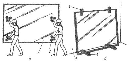 Витринное стекло устанавливают в следующем порядке. Ящик со стеклом подают к столу для раскроя стекла. Рабочие снимают с него крепежные металлические полосы ломиками-гвоздодерами, вынимают поочередно листы стекла вакуум-присосами и укладывают на стол.