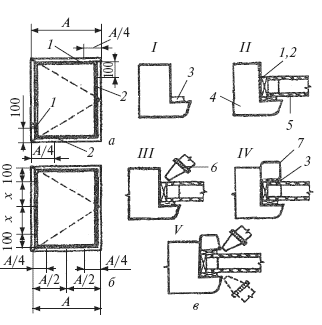 Рис. 177. Установка стеклопакетов в оконные блоки: а – расположение опорных и распорных прокладок; б – расположение боковых прокладок; в – последовательность работ по установке стеклопакетов: I – наклейка боковых прокладок; II – установка стеклопакета-распорных и опорных прокладок; III – нанесение пистолетом слоя нетвердеющей герметизирующей мастики вдоль торцов стеклопакетов: IV—установка боковых прокладок и штапиков; V – уплотнение зазоров мастикой с помощью пистолетов; 1 – распорная прокладка; 2 – опорная прокладка; 3 – боковая прокладка; 4 – оконный переплет; 5 – стеклопакет; 6 – пистолет; 7 – штапик-раскладка по стеклу