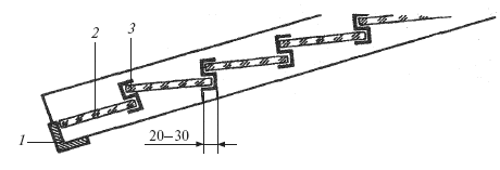 Рис. 178. Порядок укладки и крепления стекла при остеклении крыш: 1 – бортик; 2 – стекло; 3 – кляммер