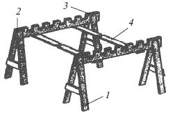 Рис. 179. Стол-верстак: 1 – основание; 2 – гребенка поперечного бруса; 3 – резиновая обкладка под стеклопрофилит; 4 – доска крепления основания