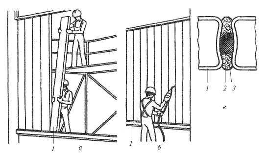 Рис. 181. Монтаж ограждений из отдельных элементов стеклопрофилита: а – монтаж ограждений; б – уплотнение стыков герметиком-мастикой; в – узел соединения стеклопрофилита; 1 – стеклопрофилит; 2 – уплотнитель-резина; 3 – мастика