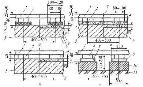 При укладке паркетных досок по сплошному звукоизоляционному слою из древесноволокнистых плит основание очищают от мусора и пыли, затем раскладывают плиты насухо с промежутками 5–8 мм и прирезают их к выступающим частям помещения. Затем один рабочий поднимает плиту, а другой подливает под нее горячий битум и разравнивает его гребенкой, после чего плиту опускают на основание, покрытое битумом, и прижимают к нему после наклеивания нескольких плит проверяют их горизонтальность и при необходимости для выравнивания поверхности под них подливают дополнительно битум. Поверхность наклеенных плит очищают скребками, щетками и грунтуют. Затем по древесноволокнистым плитам также на мастике настилают паркетные доски, причем их укладывают прямыми рядами параллельно одной из стен помещения так, чтобы крайняя