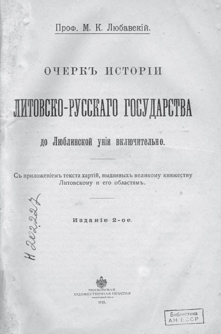 Примечание. Настоящее второе издание «Очерка истории Литовско-Русского государства до Люблинской унии включительно» воспроизводит без существенных изменений первое издание и вызвано тем, что первое издание уже разошлось в продаже.
