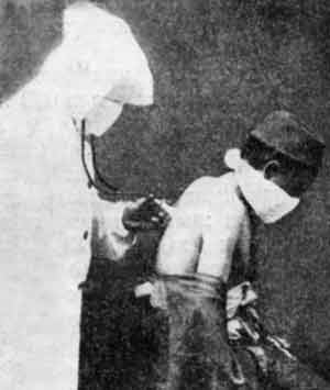 Защитой персонала были: халаты с капюшонами, боты, резиновые перчатки (у китайцев брезентовые рукавицы) и респираторы, которые заготовлялись сестрой в больших количествах следующим образом: бралось один аршин обыкновенной медицинской марли, в середину вкладывался величиной с ладонь слой ваты, который закрывался по длине марли с обеих сторон. Концы марли разрывались пополам, отчего по длине респиратора образовалось 4 конца. Когда респиратор в таком готовом виде надевался (предварительно они все стерилизовались) на лицо, закрывая нос, рот и подбородок, то 2 нижних конца, идущие с обеих сторон подбородка, шли вертикально и завязывались на маковке головы, а два верхних конца, идущие от глаз и носа, шли горизонтально и завязывались на затылке. Только при таком устройстве и способе ношения респираторы никогда не сползали и не сваливались.