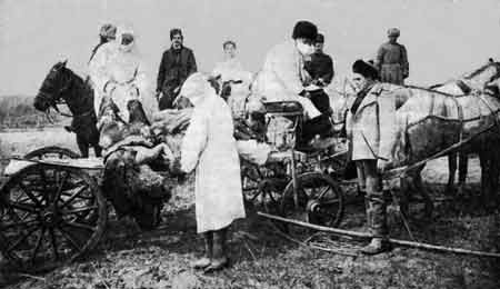 Нередко на один только выезд приходилось затрачивать 3–4 часа и, если к тому добавить, что выезды происходили при морозе в 25–30°С, то станет понятным, почему работа персонала летучего отряда, приходившего по несколько раз в день в ближайшее соприкосновение с чумными больными, была одной из самых тяжелых и опасных в Харбине. Были дни, когда персоналу отряда приходилось поднимать около 60 больных и трупов (рис. 62).