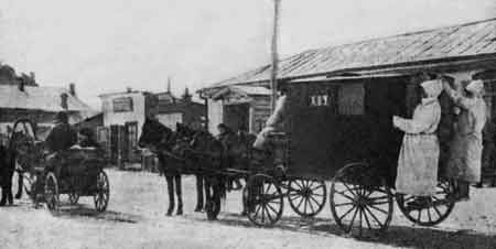 Врач отряда выезжал только в том случае, если вызов исходил не от участкового врача. На месте вызова врач должен был установить, чумной ли больной или труп, или нет. В зависимости от этого он отправлял подозрительного на чуму больного в Московский чумный барак, а труп на чумное кладбище; такую препроводительную записку врач давал фельдшеру, который и сопровождал вместе с двумя санитарами карету или линейку до места назначения (рис. 63).
