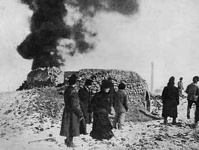 Всего первоначально уложили 26 трупов, поверх них было вылито 6 банок керосина в 86 фунтов каждая, далее, поверх положили ряд дров толщиной наполовину меньше, затем, снова был уложен ряд трупов количеством 20; опять дрова, но они уже не укладывались, а разбрасывались поверх и в промежутках между трупами, в наименьшем количестве, вылито 4 банки керосина, затем, опять последовала укладка трупов и дров. Всего было уложено 78 трупов (3 детских, 2 женщин и 75 взрослых мужчин). Верхняя часть кучи, состоящая из переложенных вперемежку трупов и дров, выступила над поверхностью земли почти на 2 аршина. Печь была зажжена в час дня и к 8 часам вечера вся масса превратилась уже в пепел. Причем керосина было вылито 23 банки или 20,5 пудов. Дров ушло 5 куб. саженей на сжигание трупов и одна куб. сажень на оттаивание промерзшей почвы при рытье ямы.